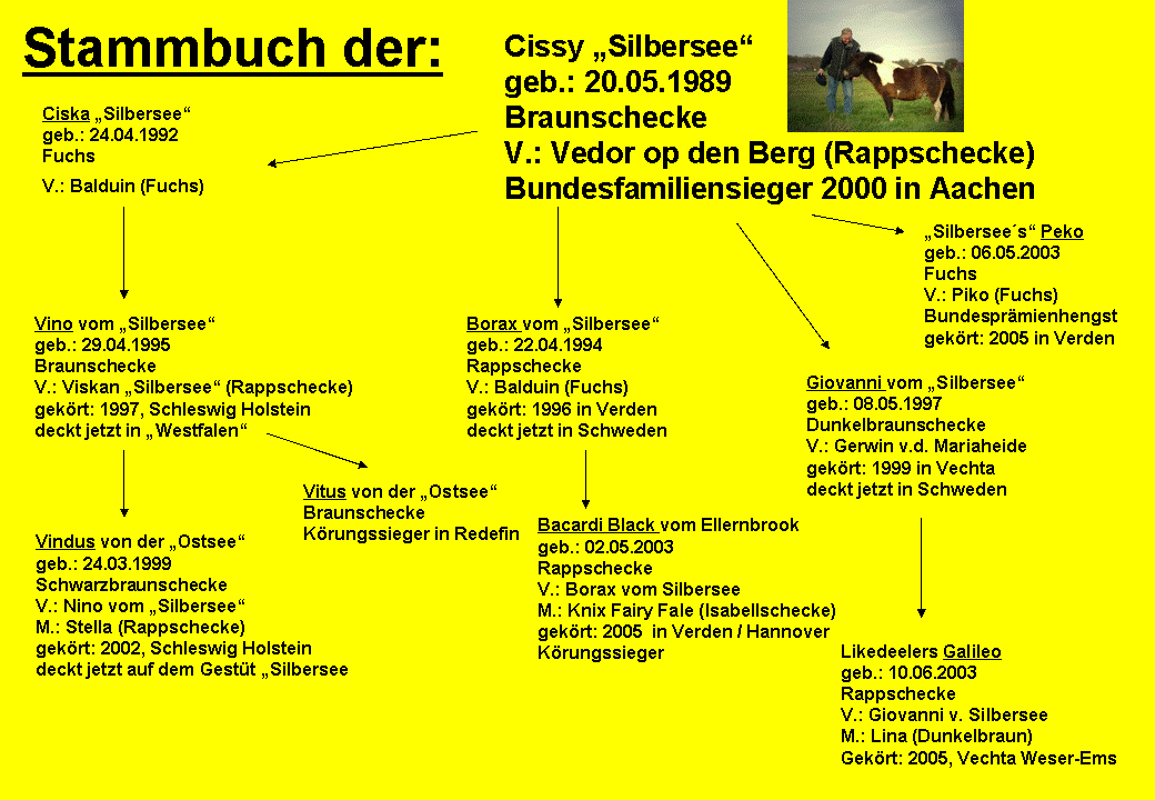 Silbersee´s Goldfee geb. 25.06.02 / Fuchstigerschecke V.: Parlington Playboy (Fuchs) M.: Silbersee´s Gambia (Fuchstigerschecke) Silbersee´s Goldfee wurde als Fohlen prämiert und die Siegerstute der Bezirksstutenschau 2005 in Tannenhausen in der Klasse der Deutschen Partbred Shetlandponys.