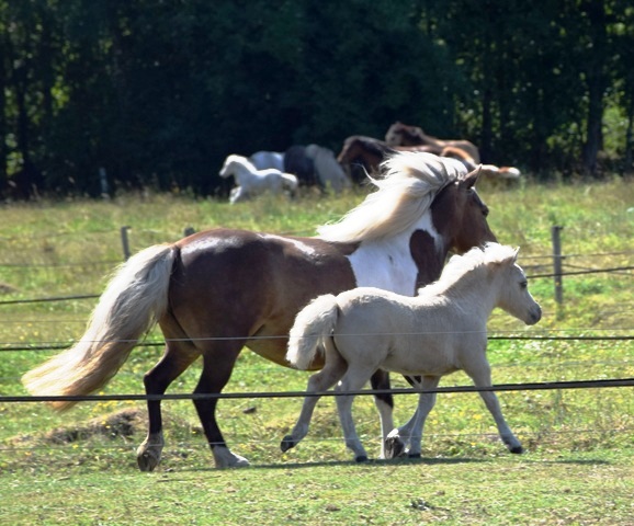 - Windfarben - *22.07.10 - wird ca. 100 cm Vater: Luxus, Dunkelfuchs mit weißem Behang Mutter: Silbersee's Cissy, Braunschecke - Siegerstute - hat bereits 3 gekörte Söhne -