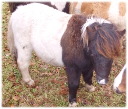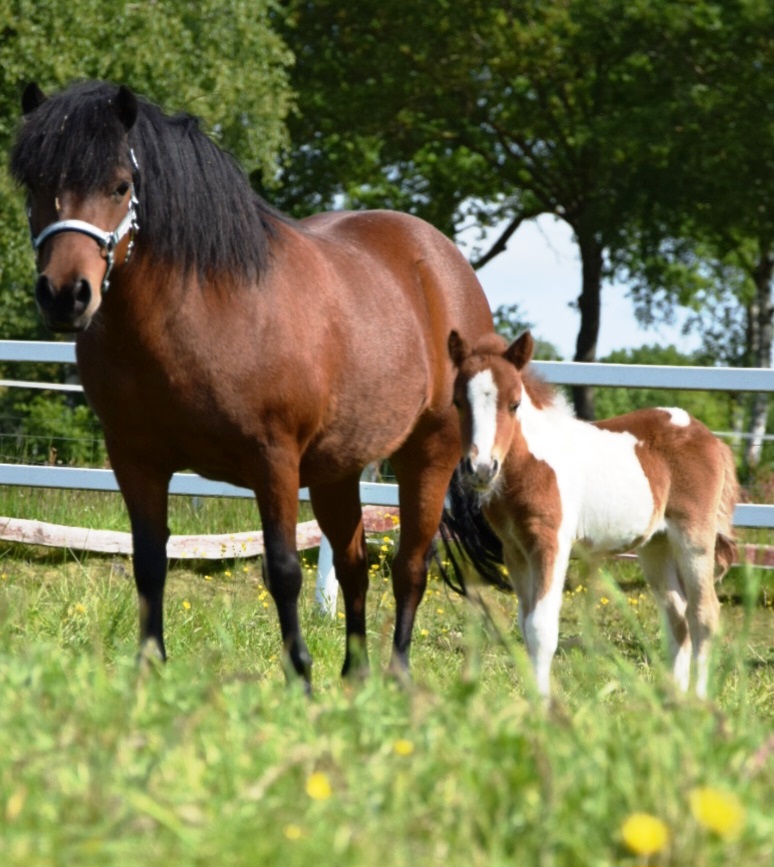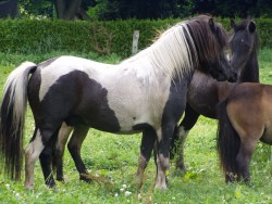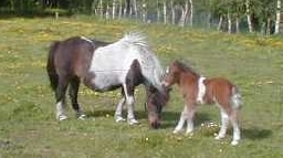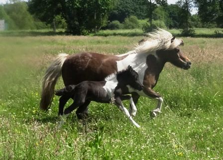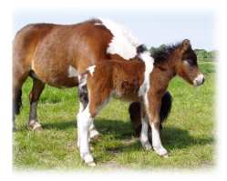 Daisy * 01.04.97 - Fuchsschecke- 98 cm V.: Seva Toppo (Fuchsschecke) M.: Daniela (Rappschecke) Daisy (Stute hinterm Fohlen) ist eingeritten und eingefahren.
